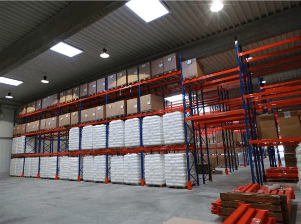 Estantería selectiva de doble profundidad en bodega industrial, Dinova Colombia. Almacenamiento eficiente y seguro.